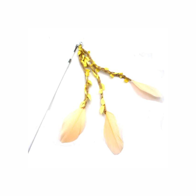The stick features 3 beige sisal ropes with toy leaves and feathers attached that will flutter like birds as you wave it around.
