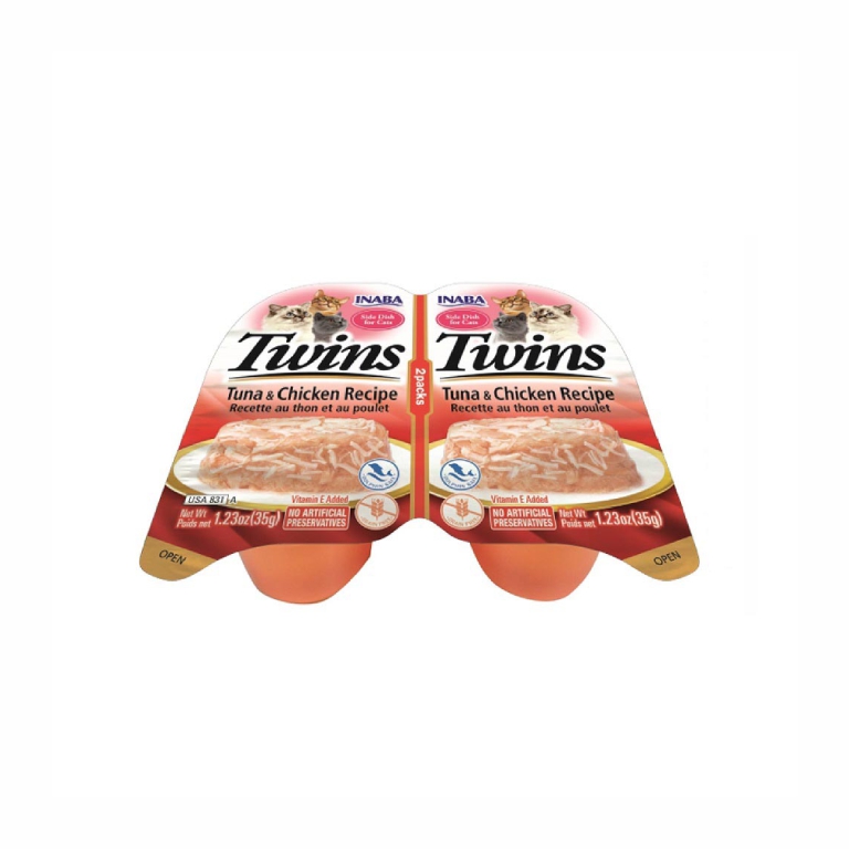 MADE WITH WHOLESOME INGREDIENTS YOU CAN TRUST: Every Inaba product is made with yummy, human’grade ingredients including farm’raised chicken and/or wild’caught tuna’ A HYDRATING, LOW’CALORIE SNACK: each 1.23 ounce serving contains 89.5% moisture and only 20 calories, plus we’ve added Vitamin E for immunity and Green Tea Extract as an antioxidant, so this is a snack you can feel good about feeding your feline’ TWICE THE TOPPERS: Twins are two single serve portions of shredded chicken suspended in a savory chicken broth gel?e. Simply break apart, pull back the lid and use as a topper on wet or dry cat food or as a side dish/complement to their meal’ SIMPLY DELICIOUS: Simple ingredients without grains, preservatives and artificial colors served in a cup with an easy’to’peel freshness seal that helps lock’in all the yumminess you have come to expect from Inaba