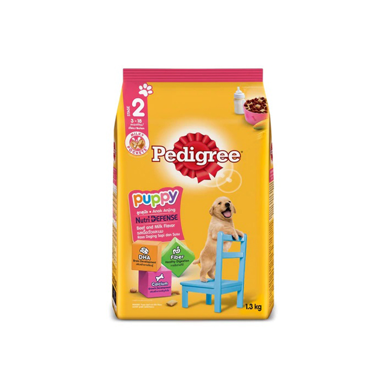 Pedigree Puppy Dry Dog Food Beef and Milk Flavor 3’18 months Omega 6 and Zinc ‘ for healthy skin and shiny coat Calcium and Phosphorus ‘ for strong bones and teeth Dietary Fiber ‘ for digestive system Protein ‘ for strong muscles Vitamins and Minerals ‘ for body system to work effectively. Pedigree Puppy Nutri Defense for puppy aged 3 to 18 months is the right choice after mother’s milk for puppies. Pedigree Puppy Nutri Defense consists of DHA, fiber and calcium which help in terms of brain development, healthy digestion, and growth development so he can grow healthy and happy.